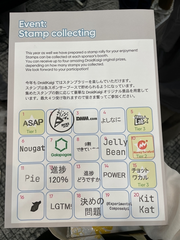 各企業様ごとに出題されるクイズや、アンケートに回答すると企業様のオリジナルグッズがもらえます。またスタンプラリーもあり、集めるとDroidKaigiオリジナルグッズがもらえました。
